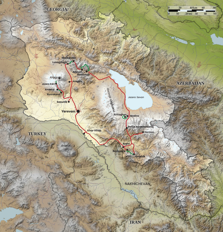 In the morning, on the way from Hermon, we will stop in the neighbouring village of Yeghegis, where we will take an approximately 2 km walk through the village and experience typical life in a remote Armenian village. The next stop will be the village of Areni, where we will visit the extremely important archaeological site, Areni 1 cave, in which the world’s oldest winery, leather shoe, and skirt were found, along with a number of other significant discoveries. From there, we will drive to the Khor Virap Monastery (4th–17th century) south of Yerevan, which offers a beautiful view of the biblical Mount Ararat, where Noah’s Ark is said to have landed. Khor Virap lies on a low hill, and St Gregory the Illuminator was imprisoned here for 13 years before Christianity became the official state religion in 301. The former Armenian capital of Artashat was also located in the immediate vicinity. After the tour, we will drive to Yerevan, check in to the hotel, and have dinner in one of the restaurants in the city centre.